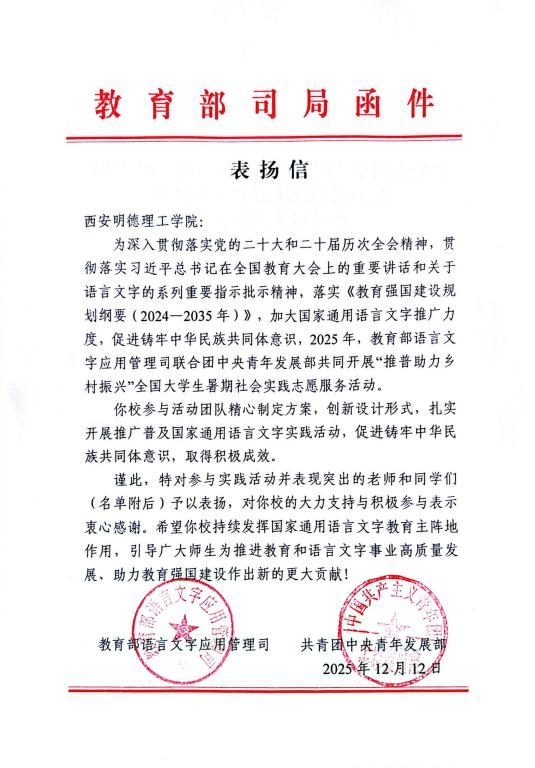 近日,学校收到教育部语言文字应用管理司与共青团中央青年发展部联合印发的表扬信,对“心相通·语先行”赴新疆若羌推普实践队在2025年“推普助力乡村振兴”全国大学生暑期社会实践志愿服务活动中的突出表现予以高...