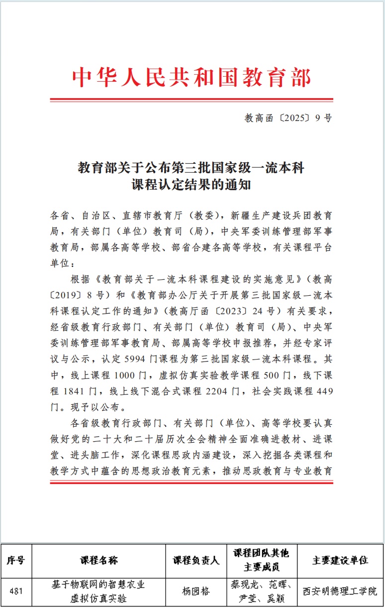 近日,教育部发布《关于公布第三批国家级一流本科课程认定结果的通知》(教高函〔2025〕9号),ac米兰杨园格老师主持的《基于物联网的智慧农业虚拟仿真实验》课程成功入选第三批国家级一流本科课程(虚拟仿真实验教...