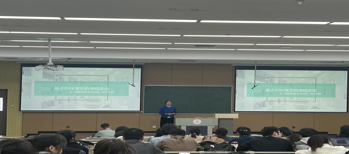 李淑玲副教授做了题为“基于OBE理念的课程建设---以《数据库技术与应用》课程为例”的报告。解读了“以学生为中心”“产出导向教育”“持续改进”三大理念,同时结合毕业要求,详细阐述了教学目标、教学内容、教学过程和教学评价等四个环节的质量控制要求。提出教学目标明确化、教学内容定制化、教学过程体验化、教学评价多元化。