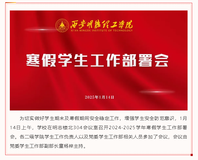 印发《关于做好2025年度寒假学生安全教育工作的通知》《关于做好2025年春季开学学生教育管理工作的通知》,做好学生安全教育、宿舍隐患排查、重点学生关心关怀等工作。发布《致全体学生与家长的一封信》,提醒家长共同做好学生假期安全教育管理。