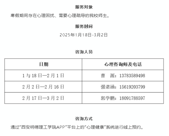 为做好寒假期间学生心理健康服务工作,ac米兰专兼职心理咨询师将于寒假期间持续面向全体学生提供线上心理咨询服务,确保有需要的学生能及时、便捷的获得心理支持和专业帮助。