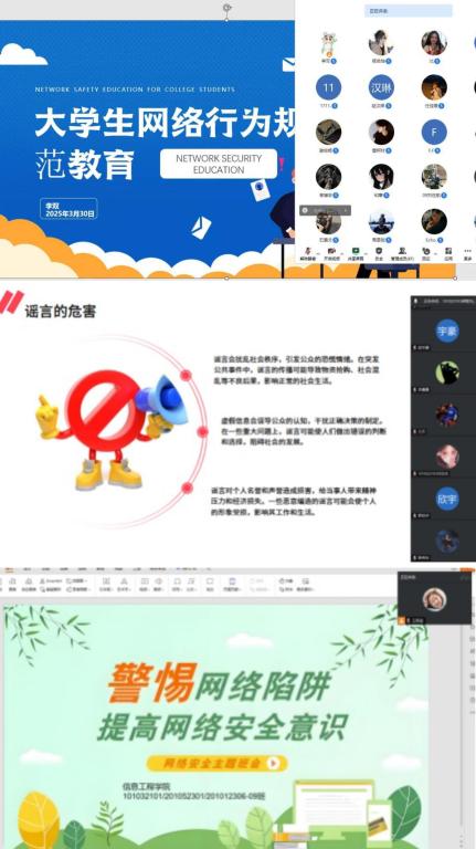 为深入贯彻国家关于加强网络文明建设和网络安全教育的最新要求,积极响应教育部关于提升大学生网络素养的号召,2025年3月30日至31日,信息工程学院覆盖全体全院学生开展网络文明及网络安全主题班会。此次班会旨在增强同学们的网络安全意识,培养健康的网络使用习惯,共同营造清朗的网络空间。