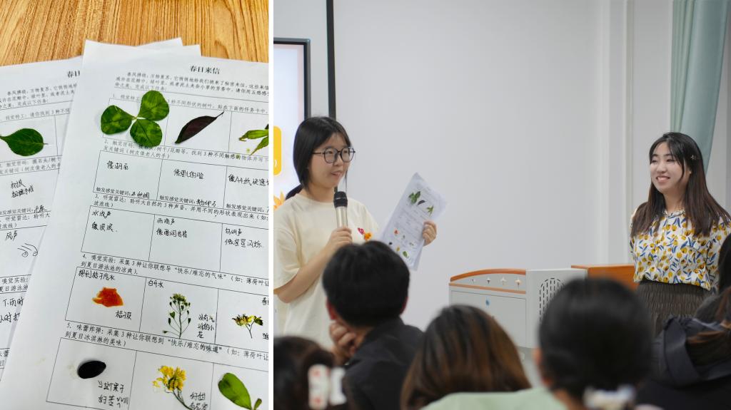 随后,兰艳老师借助展示学校的“AI春景”视频,带领同学们全方位感受校园春景,从视觉、听觉、嗅觉、味觉和触觉五感出发,沉浸式领略春日魅力。同学们踊跃分享自己的“春日来信”,用生动可爱的语言讲述在自然中的新奇发现,现场满是欢声笑语。在分享过程中,老师向同学们讲述,春季因季节变换,部分同学可能会出现心情低落,或是因学业等压力产生焦虑情绪。她耐心地向大家解释,这些均为正常现象,并推荐了“20分钟公园疗法”,鼓励同学们化身“自然密探”,走进公园、亲近自然,舒缓不良情绪。