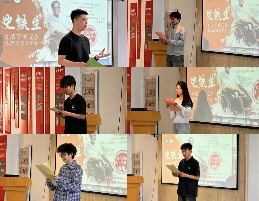 活动伊始,主持人介绍了《墙下短记》的创作背景及文学价值。史铁生以深邃的哲思和细腻的笔触,探讨了生命、困境与超越的主题,引发读者对人生意义的思考。在作品赏析与感悟分享环节,师生与社区代表结合自身经历,畅谈对“墙”这一意象的理解。学生党员周锦权从辩证角度分享,墙既是一种限制,让人感受到边界,同时也是一种保护,给予人安全感;张铭宇同学则从探索精神出发,提出,墙的存在激发了人们对未知的向往,促使我们不断突破自我。西安海和田文化创意产业发展有限公司党务工作者周欢结合工作实际进行了分享,他谈到,凡墙皆是门,我们既要正视现实中的“墙”,更要主动寻找跨越的可能。
