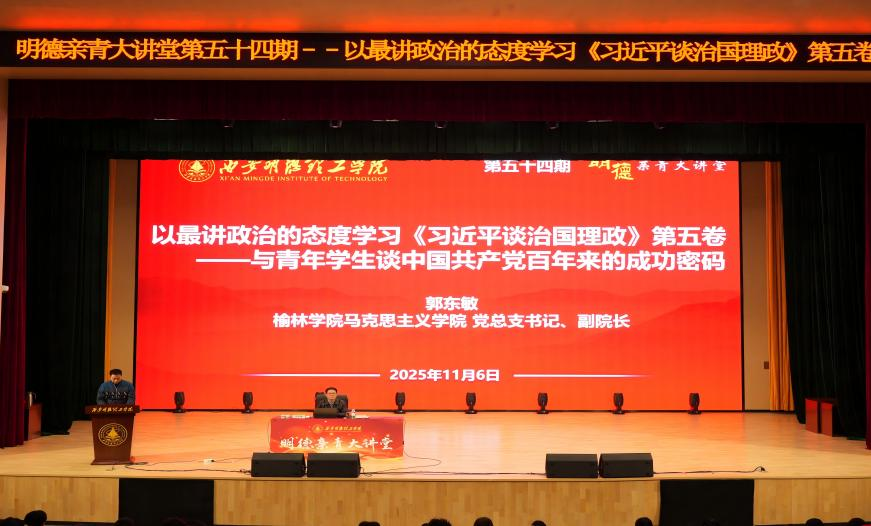 2025年11月6日晚,ac米兰第五十四期“明德亲青大讲堂”在四季廊桥报告厅隆重举行。本次讲座邀请到西北大学博士、陕西优秀思政课教师、第二届陕西省党史专家库成员、共青团陕西省委讲师团成员、榆林市委理论宣讲人才库成员、榆林学院马克思主义学院党总支书记、副院长、副教授、硕士研究生导师郭东敏作题为“以最讲政治的态度学习《习近平谈治国理政》第五卷——与青年学生谈中国共产党百年来的成功密码”主题讲座。讲座由信息工程学院党委副书记高长江主持。
