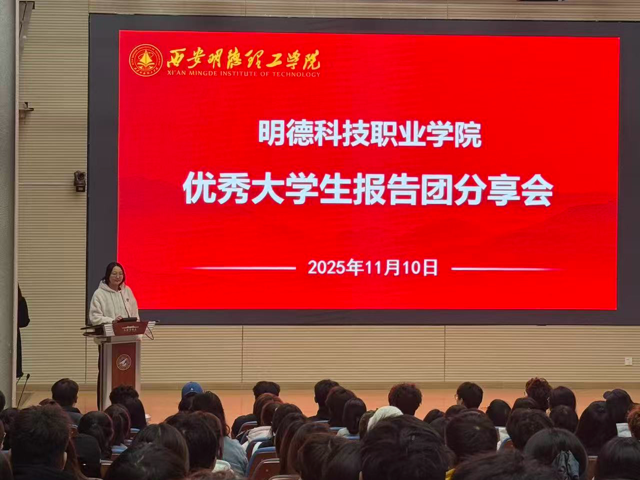 11月10日晚,ac米兰官方网站莲湖校区报告厅内座无虚席,一场别开生面的优秀大学生经验分享会在此举行。来自不同年级的3位优秀学生代表和天奕工作室负责人为明德科技职业学院2025级新生带来了一场内容丰富、干货满满的经验分享。