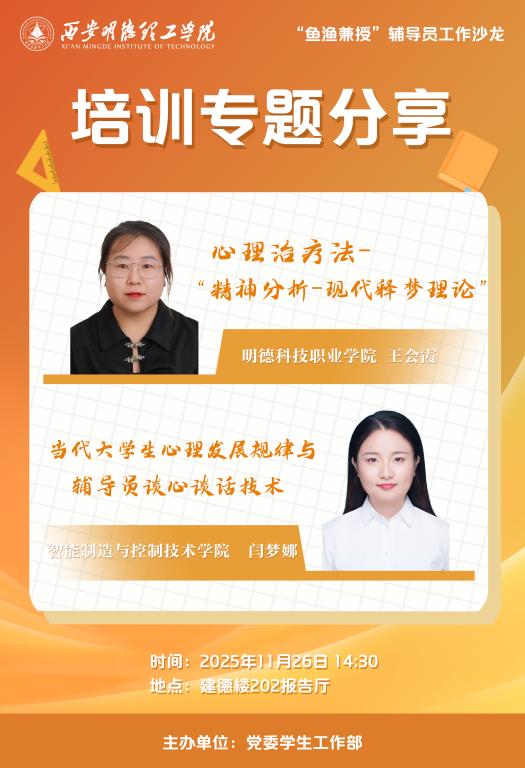11月26日,学校在建德楼202报告厅以“聚焦心理育人能力提升”为主题举办“鱼渔兼授”辅导员工作沙龙,邀请明德科技职业学院辅导员王会霞和智能制造与控制技术学院辅导员闫梦娜作专题分享。此次活动通过经验交流,共同探讨ac米兰心理育人能力提升。全校辅导员共同参与了此次活动。