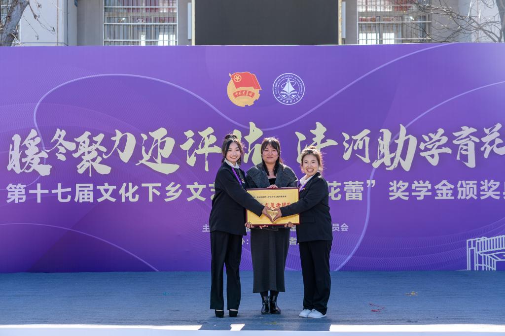 11月29日上午,学校“暖冬聚力迎评估·沣河助学育花蕾”第十七届文化下乡文艺汇演暨“花蕾”奖学金颁奖典礼在“沣河行动”义务家教社会实践基地翁家寨村委会大院隆重举行。翁家寨村委会委员翁长春、西安天爱启智学校执行校长张静、西安沣峪口滦镇养老公寓院长黄兴龙,学校党委学生工作部、校团委、各二级学院相关负责老师,青年志愿者服务团成员,受教儿童及家长代表共计两百余人参加活动,共同见证这场公益助学与文化振兴交融的盛会。