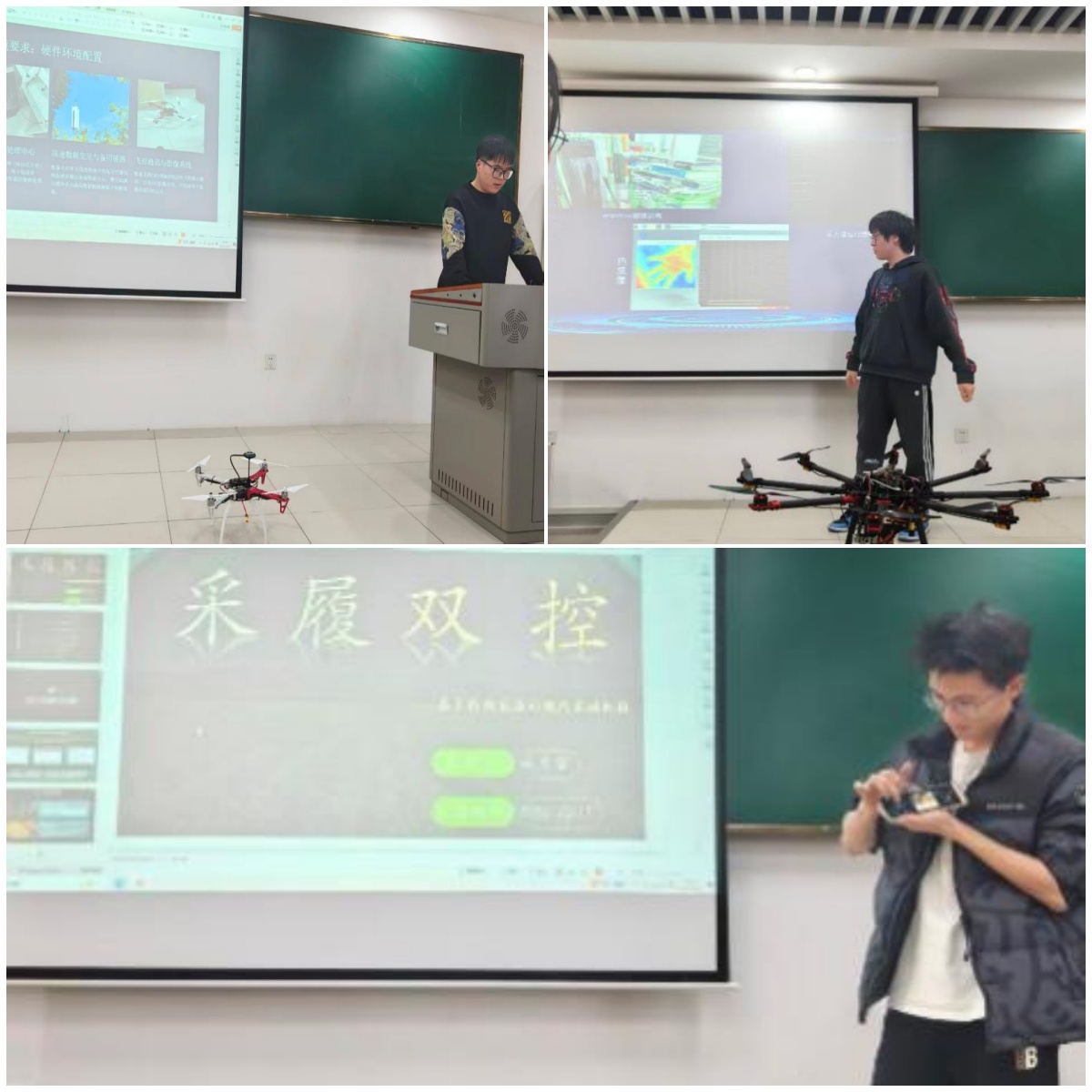 比赛现场,各团队精彩呈现了多样化的作品。从基于履带式结构的“采履双控”现代农业采摘机械,到融合ESP32主控的火灾应急小车;从实现多光谱数据采集的无人机系统,到基于TensorFlow的热成像物体识别方案,作品覆盖硬件设计、算法优化、系统集成等多个维度。在展示过程中,选手们结合PPT详细阐述作品的设计理念、技术路线及应用场景,同时通过实物演示让答辩老师更直观地了解作品功能,如“采履双控”团队展示了作品在复杂地形下的稳定性和采摘效率,无人机组则现场操作六旋翼飞行器,结合投影屏幕实时呈现多光谱数据处理流程,引发现场观众的热烈讨论。