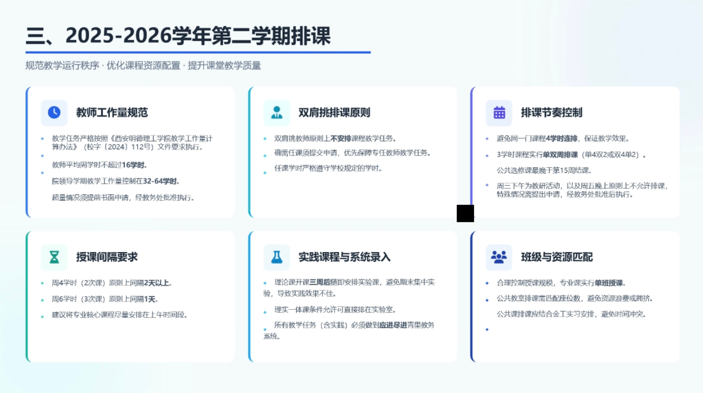 会上,于莉副院长首先传达了2025-2026学年第一学期第四次教学工作会议要求及精神,随后围绕八大核心工作作出详细部署。在人才培养与教学大纲建设方面,明确需完成2024年人才培养方案、课程教学大纲及岗位实习课程大纲的修订工作。针对本学期末期末考试,强调已完成前期部署与命题审查,所有试卷全部收齐,要求严格执行考试命题细则、阅卷评分规范及试卷归档标准。就2025-2026学年第二学期排课工作,明确相关规定要求,旨在规范教学运行秩序、优化课程资源配置。同时,会议对课程与课堂教学、教学资料管理、岗位实习质量管控、实验室规范运营及教学科研仪器设备使用等工作提出具体要求,强调仪器设备使用需真实记录、严禁补记,实行定期核查的闭环管理,实验室相关文档填写需严格规范。此外,会议还提倡任课教师要积极运用AI技术开展教学,推动产教融合课程建设与数智化教学深度融合,提升育人效率。