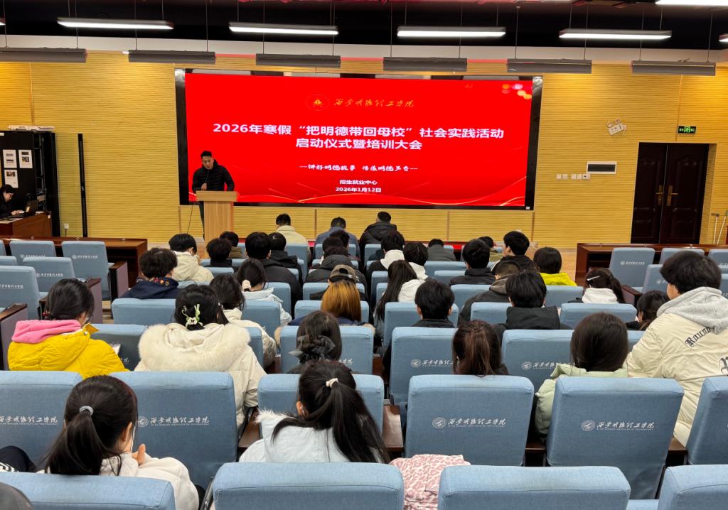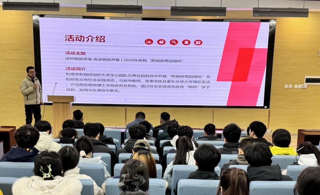 为深入实践育人理念,激励在校生积极参与招生宣传社会实践,丰富学生假期经历,同时加强ac米兰与各省市及区县优质重点生源中学的联系,提升学校影响力,1月12日中午招生就业中心在建德楼202报告厅举办“讲好明德故事 传递明德声音”——2026年寒假“把明德带回母校”社会实践启动仪式暨培训大会。招生办人员及全体学生“宣传大使”共同参加,会议由招生办公室主任朱雪松老师主持。