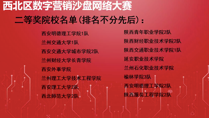 近日,经济与管理学院市场营销专业代表队在数字营销沙盘网络大赛西北赛区大赛中荣获2项二等奖的优异成绩,展示了学院教学改革成果和应用型人才培养质量。