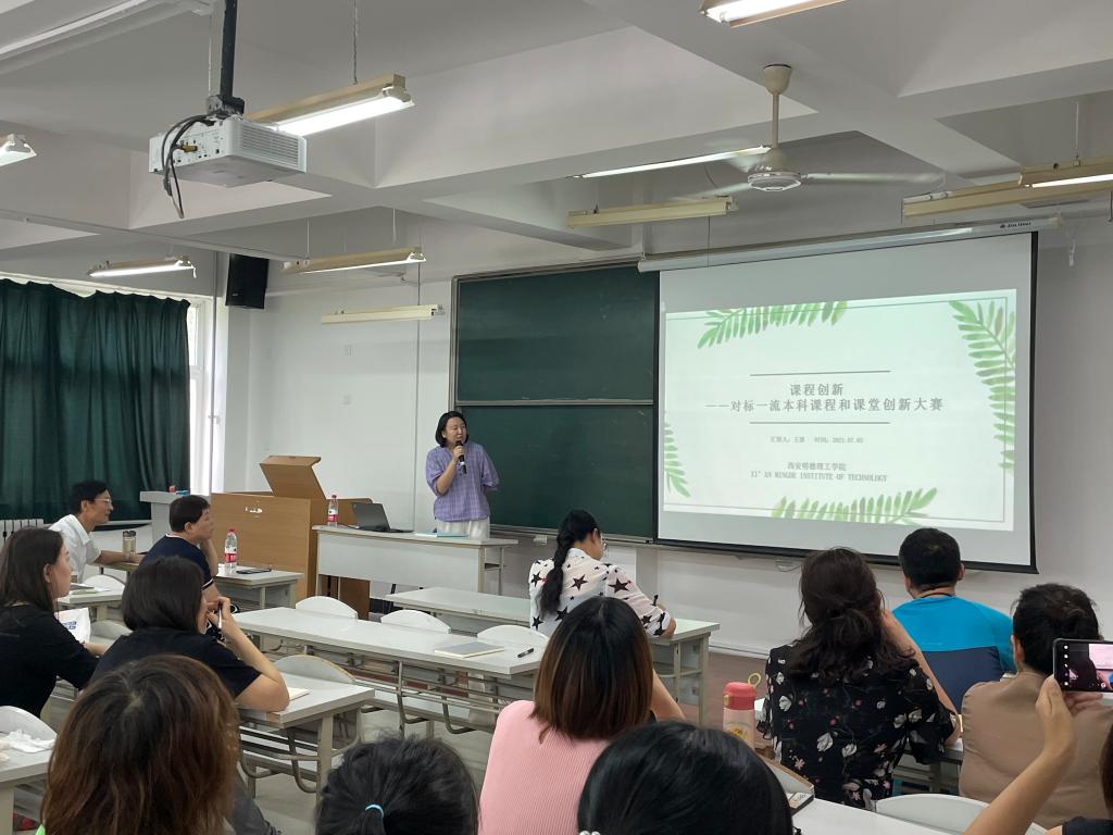 会议伊始,英语专业青年教师王茜做了题为“课堂创新——对标一流本科课程和课堂创新大赛”的分享报告。结合参加2020年陕西省第三届课堂创新大赛、2021年省级一流本科课程申报的历程,以获批2021年省级一流本科课程《英语高级口译》为例,从理论基础、教学目标、教学方法和内容、教学效果四方面对创新要素进行了阐述,强调课程内容的前沿性及课程思政元素的融入。