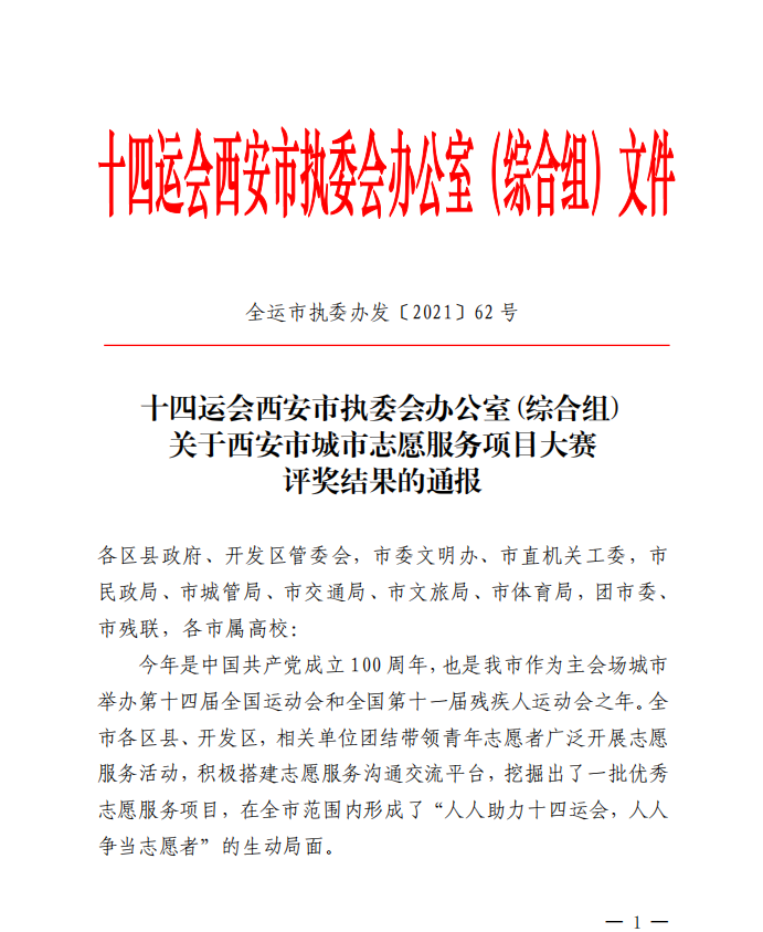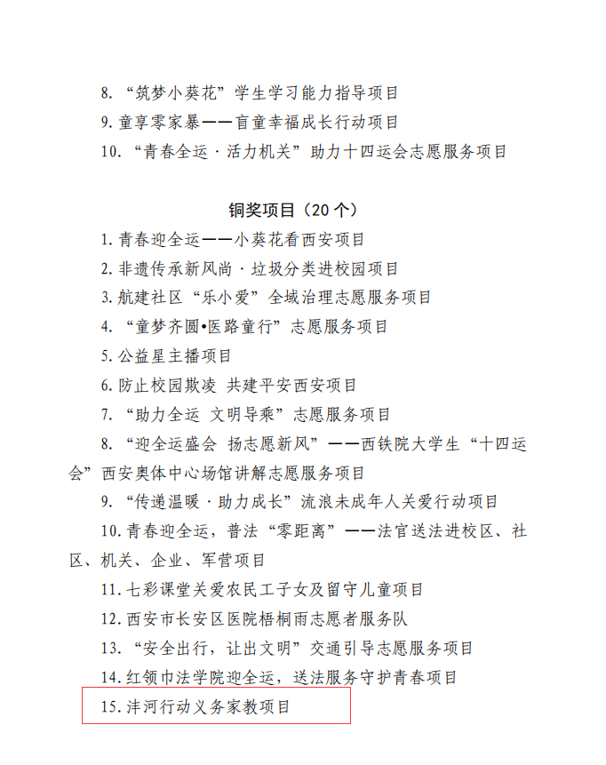 近日,十四运会西安市执委会,团市委、市委文明办、市民政局、市城管局、市交通局、市文旅局、市体育局、市残联等联合通报了西安市城市志愿服务项目大赛评审结果。ac米兰青年志愿者服务项目“沣河行动”义务教教获得项目铜奖。