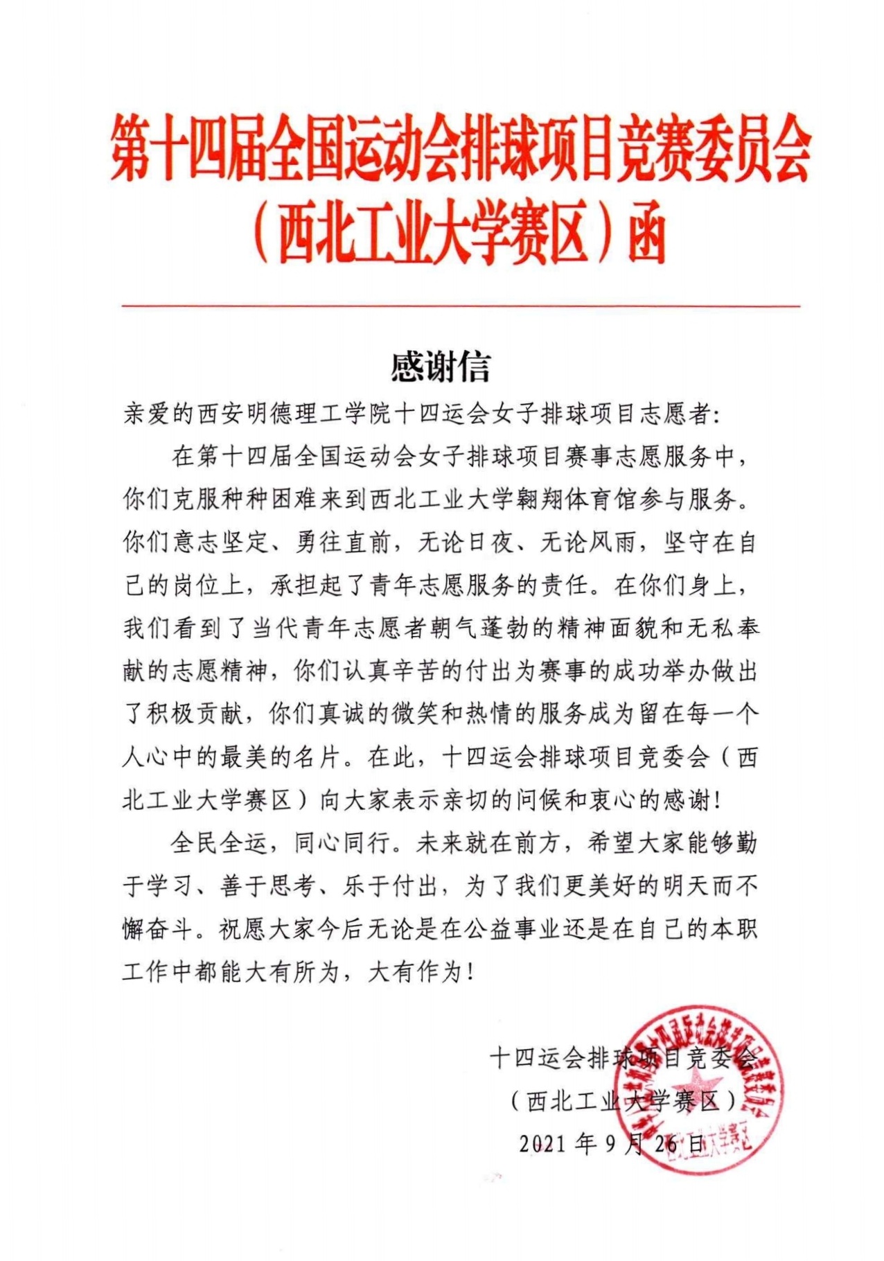 9月26日,为期11天的十四运会女子排球成年组比赛在西北工业大学长安校区翱翔体育馆圆满收官。ac米兰31名“小秦宝”志愿者以良好的精神风貌、专业的业务水平和热情的服务态度为赛事全程提供志愿服务,展示ac米兰青年学子的风采,得到了竞委会和参赛运动员的一致好评。