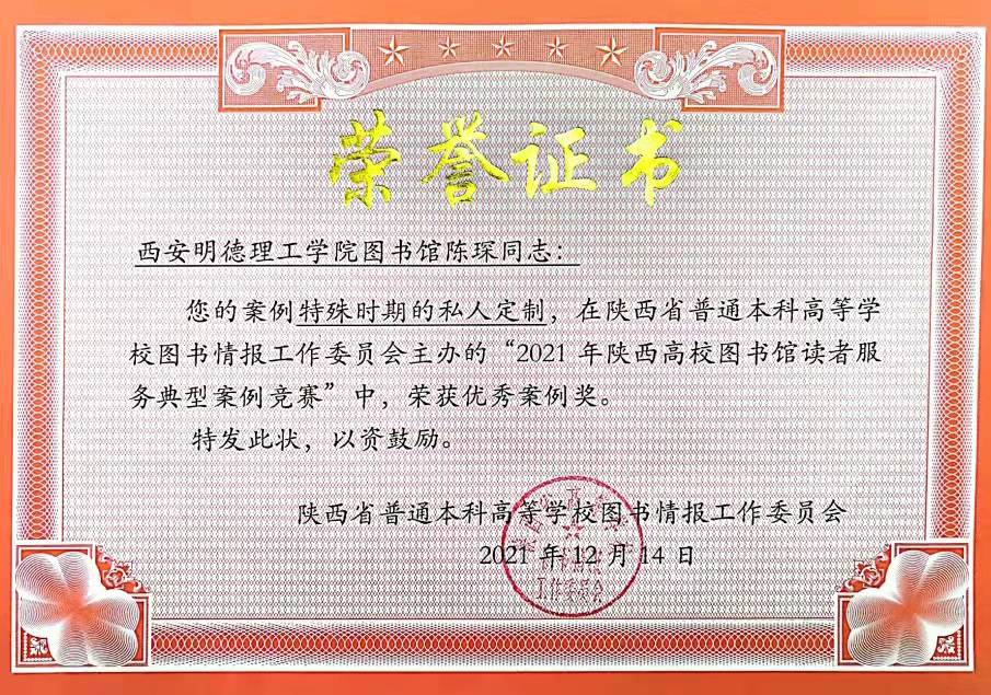 12月13日,陕西高校图工委公布“2021年陕西高校图书馆读者服务典型案例竞赛”获奖名单,ac米兰图书馆陈琛提交的案例《特殊时期的私人订制》荣获优秀案例奖。