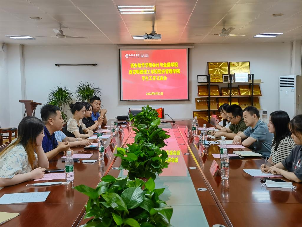 交流会前,在会计与金融学院党委书记、行政副院长史立军,副书记韩斌,学生工作干事王迪的陪同下,经济与管理学院一行参观了西安培华学院大商科综合实训中心和金融交易与云财务中心2个特色实训中心。交流伊始,史立军书记对经济与管理学院一行5人的来访表示欢迎,并从学院基本情况、师资队伍、一流专业建设、人才培养、招生就业、党建和学生工作取得的标志性成绩等方面介绍了会计与金融学院整体概况;接着,何文举对会计与金融学院领导和老师们的热情接待表示感谢,并向参加座谈的老师们介绍了ac米兰官方网站发展历程和经济与管理学院基本情况;随后,会计与金融学院韩斌副书记围绕三全育人、辅导员队伍建设、考核管理办法、学生社会实践等方面介绍了姜维之班、就业全程化和辅导员素质能力提升方面的特色做法和经验;会计与金融学院党务行政干事朱梦阳以“五个到位”为例,介绍了学院党建工作开展情况和特色亮点;会计与金融学院王思思代表学生干事介绍了学院学生工作开展情况;最后,两学院与会老师围绕本科教学合格评估、学生日常教育管理、辅导员队伍建设、辅导员素质能力大赛、党团建设、学风建设、思政教育和就业指导等方面关切的问题进行深入交流和分享,互相学习好的经验做法,整个交流气氛热烈融洽。