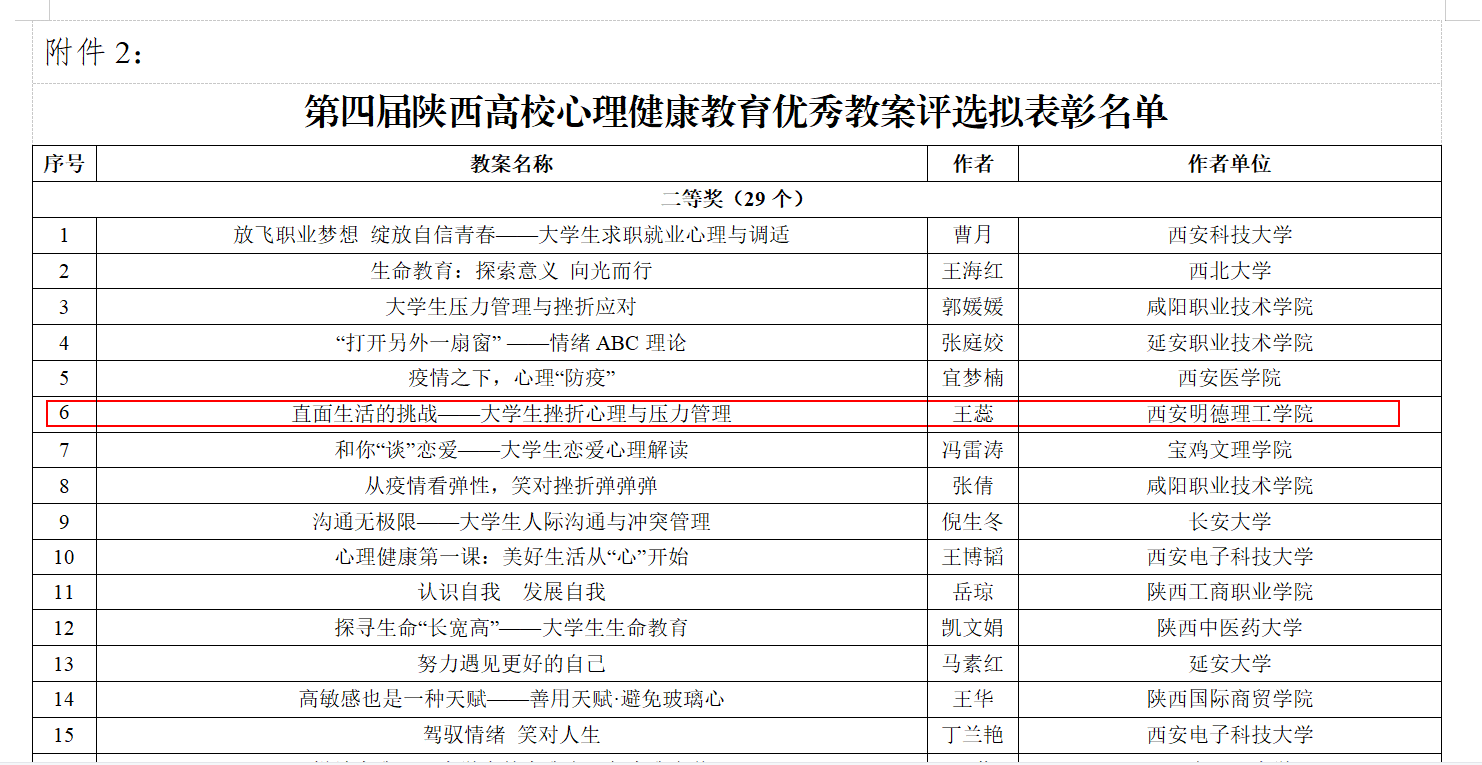 今年3月至6月,陕西省委教育工委开展第七届“阳光护航”心理育人宣传季实践活动,ac米兰积极组织推选优秀作品参加了省级比赛。ac米兰王蕊老师撰写的《直面生活的挑战——大学生挫折心理与压力管理》荣获心理健康教育课程教案省级二等奖;郭学鹏老师撰写的《重拾奋斗的信心——一例大三厌学学生的合理情绪疗法心理咨询案例》荣获心理健康教育优秀咨询案例三等奖。