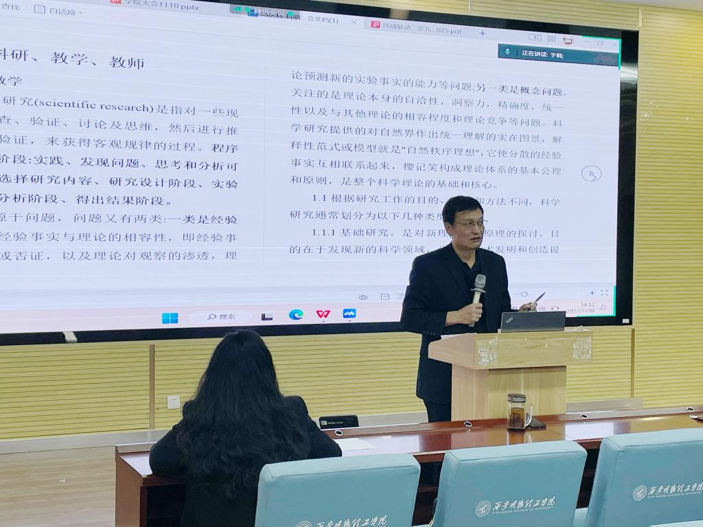 11月10日下午,语言文化传播学院在建德楼201召开科研与教学工作大会,会议采取线上线下相结合的方式进行。学院领导班子成员、全体教职工参加会议,会议由副院长刘勇主持。