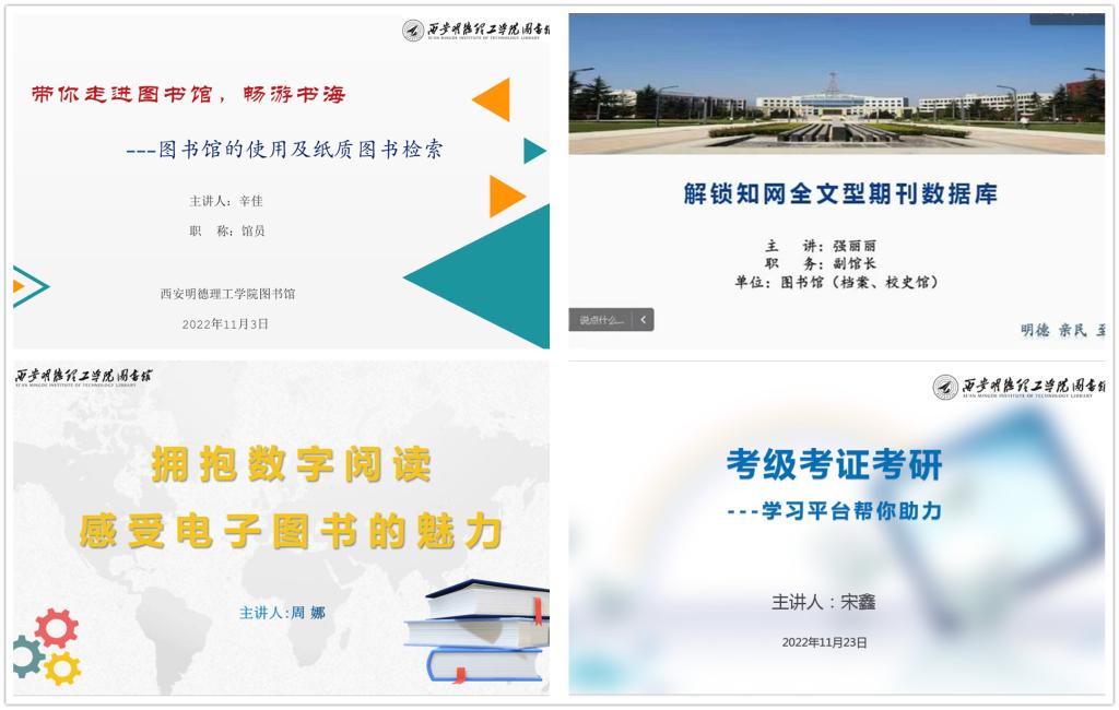 为提升广大师生信息素养及文献资源获取能力,进一步增强馆员主动服务意识,切实为学校教育教学及科研工作做好文献资源保障与服务,2022年11月2日-23日,图书馆举办信息素养教育系列讲座四场,主题依次为:带你走进图书馆——畅游书海(第一讲),解锁知网——全文型期刊数据库初探(第二讲),拥抱数字阅读——感受电子图书的魅力(第三讲)和考级考证考研——学习平台帮你助力(第四讲)。