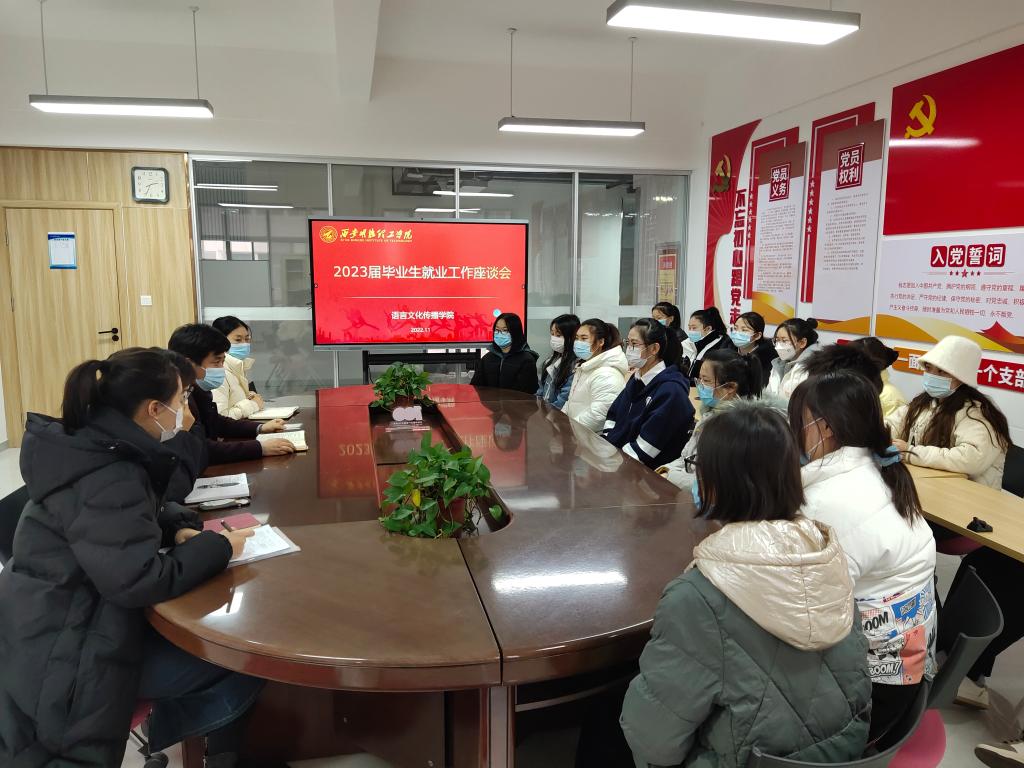 为了提升就业质量,更好推进学生就业工作开展,11月30日下午,语言文化传播学院召开了2023届毕业生就业工作座谈会,旨在进一步了解毕业生的就业动态和就业需求,更好地推进就业服务工作。毕业班辅导员梁爽、黄雪琪、周清岚以及2023届毕业生代表参加会议,会议由学院党委副书记杨峰主持。