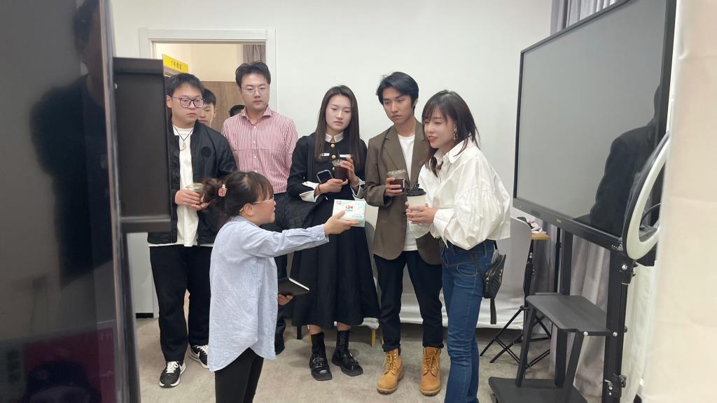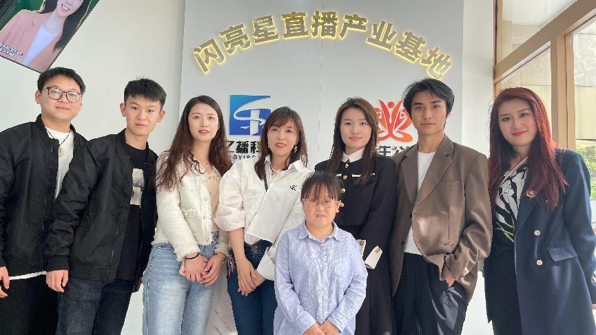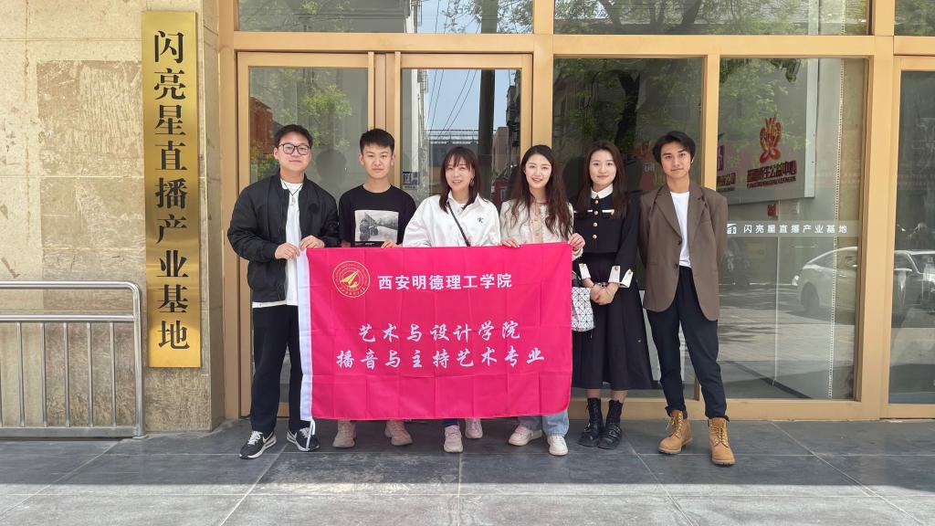 4月10日下午,ac米兰官方网站艺术与设计学院播音与主持艺术专业姚璐、张文挺、符郁和4名学生一行前往陕西闪亮亿播科技有限公司-闪亮星直播产业基地(以下简称:基地)进行校企合作交流。