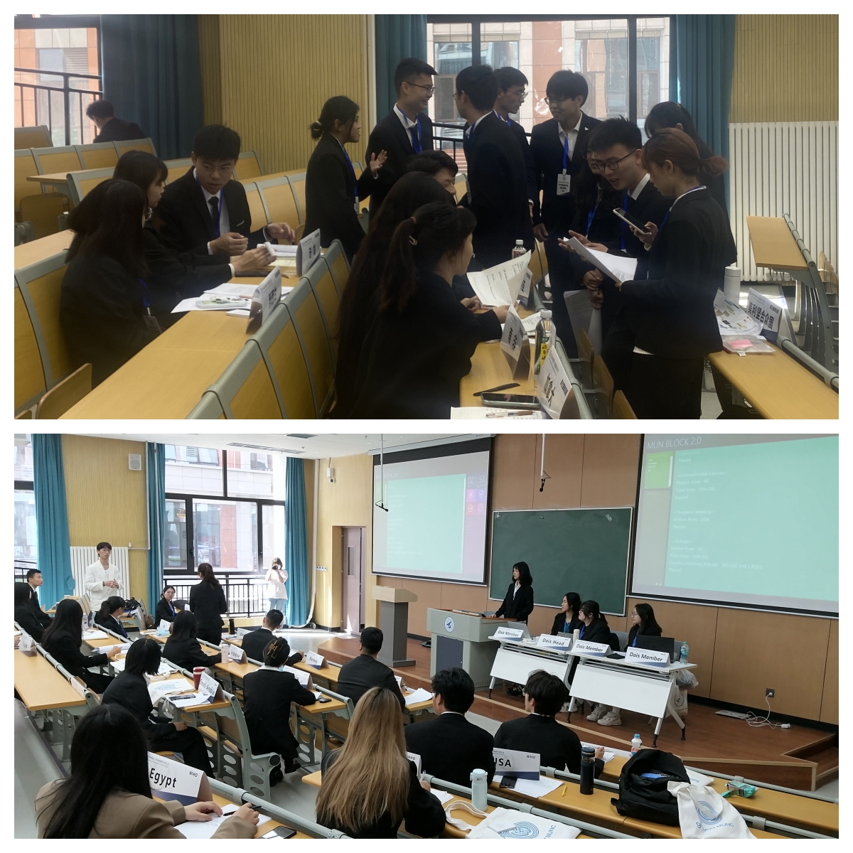 本届大会以“命运与共,携手前行”为主题,共设2个英文委员会(世界卫生组织、联合国开发计划署)、1个中文委员会(联合国难民署),分别就“突发公共卫生事件新冠疫情下的准备与应对”、“预防、制止和扭转全世界生态系统的退化”、“气候难民的权利救济”3个核心议题展开讨论。代表们在大会期间维护自己所代表国家的切实利益,通过有组织核心磋商、无组织核心磋商、自由辩论等形式就议题进行深入、全面的探讨与交流,共同商讨议题的解决方案与措施,充分展现出了代表们良好的学术素养与国际视野。两天的会期过程中,三个会场共有21名代表因贡献突出、表现优异,被本届大会授予杰出代表、最佳立场文件、最佳风采、最具潜力新人等不同奖项。
