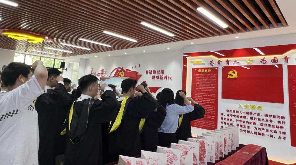 为勉励毕业生党员不忘入党初心,牢记党员使命,支部全体毕业生党员重温入党誓词,再次庄严宣誓,以饱满的热情和昂扬的姿态,共同表达心系“国家事”、肩扛“国家责”,为党的事业奋斗终身的坚定信念。
