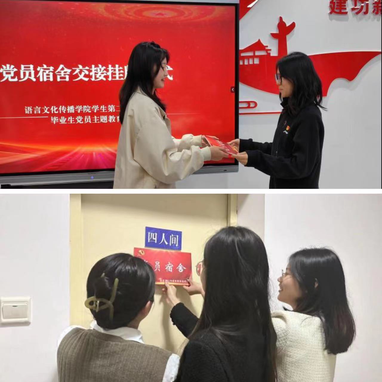 为引导全体学生党员党性锤炼,充分发挥党员先锋模范作用。2022年起语言文化传播学院开展“亮身份、树旗帜、作表率”党员宿舍挂牌活动。19级毕业生在离校之际,为全体毕业生做好文明离校榜样,打扫整理寝室将代表身份的“党员宿舍”牌摘下与新入党同志进行交接。毕业生周清岚说:“希望学弟学妹时刻牢记自己是一名共产党员,用更严格的标准要求自己,充分发挥党员的先锋模范作用,用行动影响和带动身边的同学。”