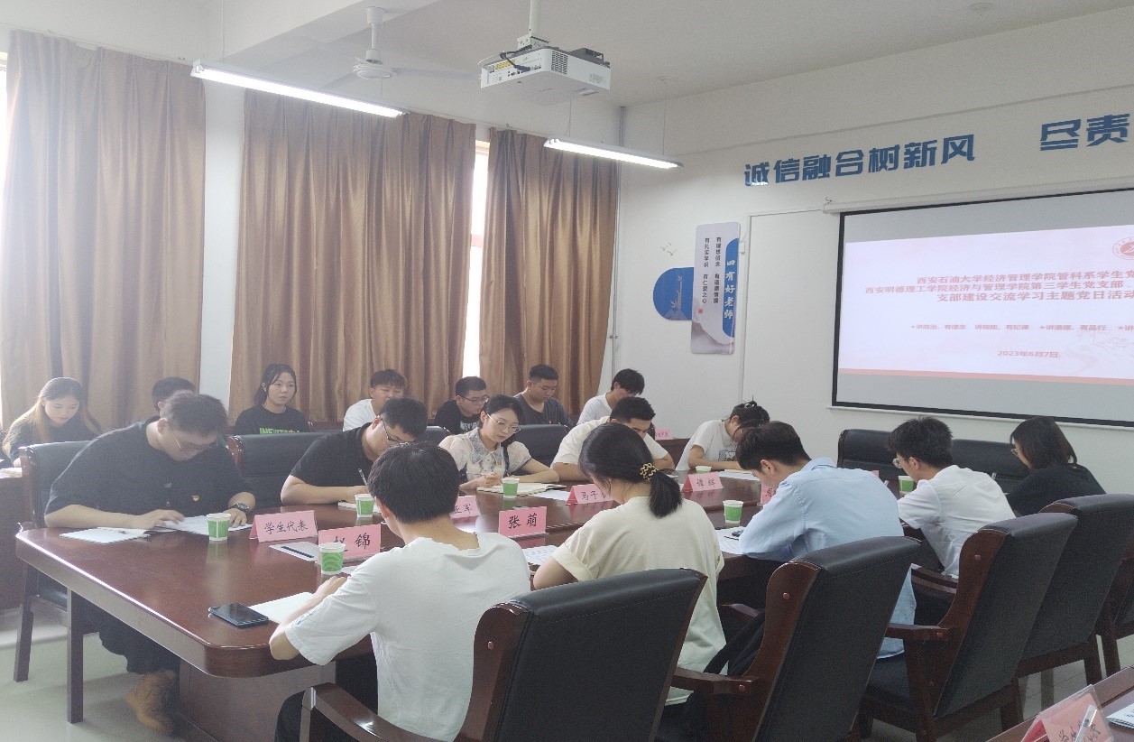为深入学习宣传贯彻党的二十大精神,推动学习贯彻习近平新时代中国特色社会主义思想主题教育走深走实,推动主题教育与加强基层党组织建设相结合。6月7日,经济与管理学院赴西安石油大学经济管理学院联合开展“以学铸魂强党性,锤炼品格建新功”主题党日活动。学院学生第三党支部书记杨亚军、学生第六党支部书记马子墨及10名学生党员,西安石油大学经济管理学院管理科学与工程系学生党支部师生参加了活动。活动由西安石油大学经济管理学院管理科学与工程系学生党支部书记王业林主持。