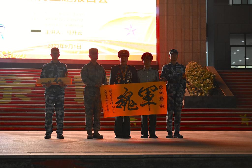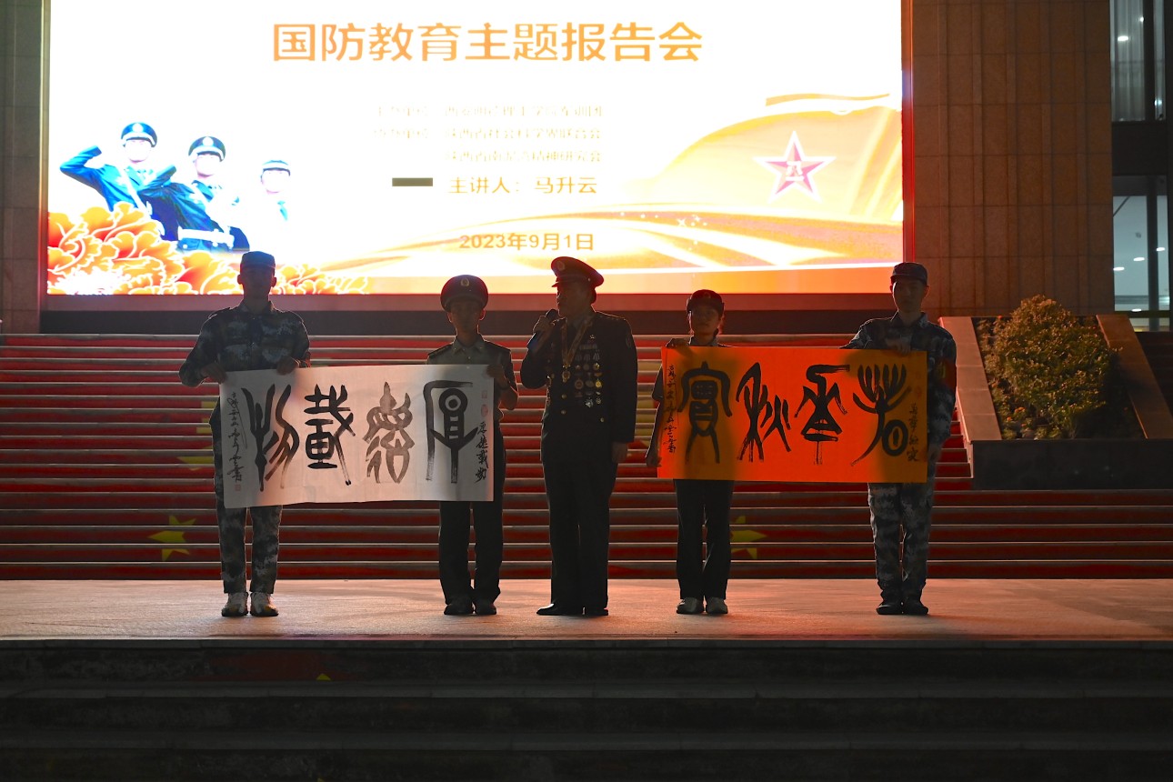 马升云以《祖国万事连我心无私奉献为人民》为题讲述了自己32年的部队生活,分享了自己在参加边防保卫战时面对三面受敌、无比艰辛的作战条件,坚守110天英勇战斗的感人故事。他强调并鼓舞新生,时代的责任赋予青年,时代的光荣属于青年,在国泰民安的盛世,更应为实现强国强军梦,努力奋斗,顽强拼搏,为党和国家做出贡献。讲座尾声,马升云向军训团赠送 “厚德载物”、“春华秋实”书法作品,借此勉励新生要向战斗英雄学习,把握时光、奋勇拼搏,争做强能力、强责任、强担当、强奉献的时代青年。