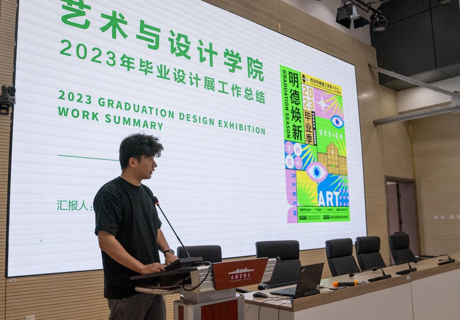 视觉传达设计专业骨干教师王加号总结2023年毕业设计展工作。他说到,2020年至2023年,自己见证了学院毕业设计展的发展和完善。在全体教师的共同努力下,2023届毕业设计展圆满完成,受到了社会各界的广泛关注和一致好评,同时,他对毕业设计展存在的问题进行了总结,希望明年的毕业设计展不断改进,越办越好。
