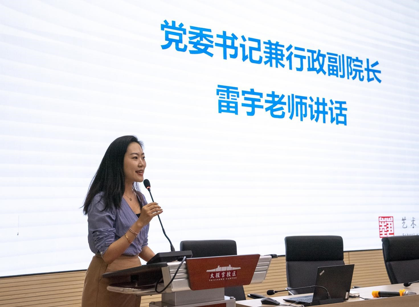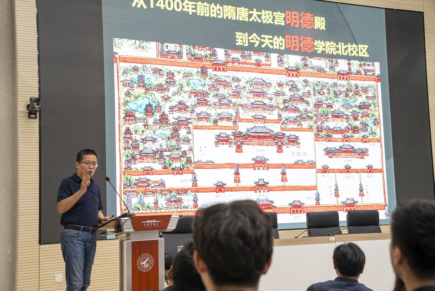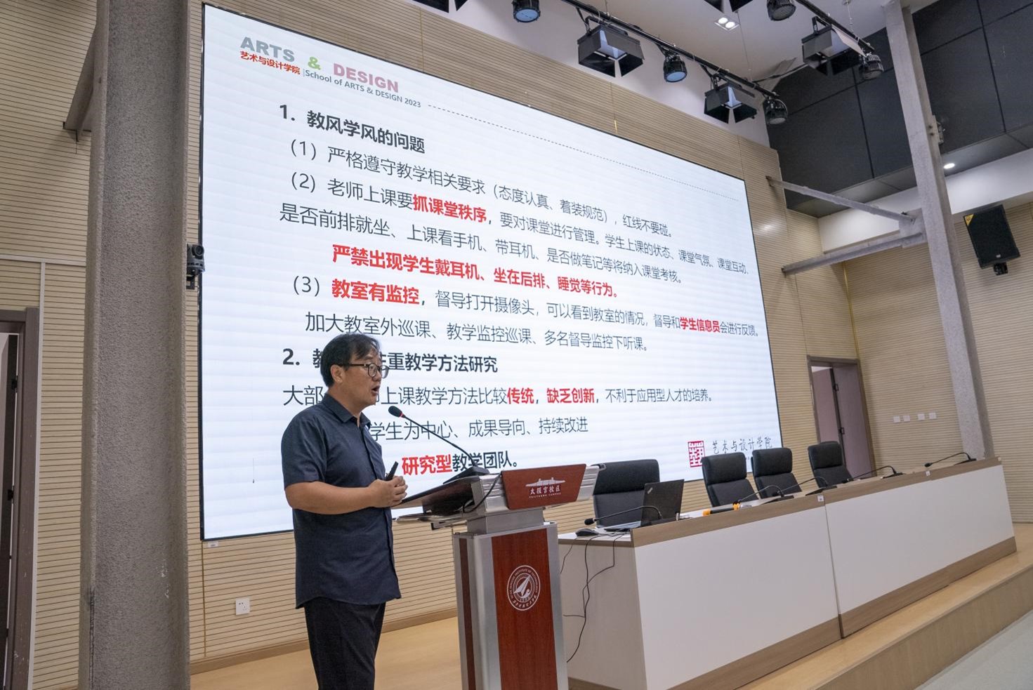 最后,院长苟秉宸总结讲话。他用大量的图片和数据向老师们介绍了艺术与设计学院的发展历程,分享了北校区的规划建设过程,分析了北校区各楼宇名字的历史文脉,使所有老师耳目一新,受益匪浅。