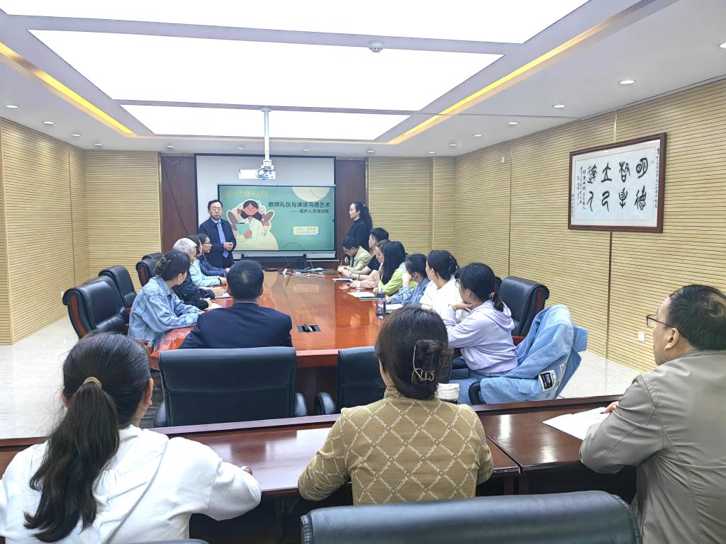 为进一步提升新入职医护人员的教育教学能力,提高教师队伍的政治素养和专业技能,激励新入职医护人员更快、更好地适应教师岗位需求,助力医护人员成长为专业合格的教师,2023年9月27日下午,教师发展中心在明志楼南207会议室组织开展医护人员“教师礼仪与演讲沟通艺术”教学能力提升培训。活动邀请通识教育学院教师张梦楚为新入职医护人员进行培训,高等职业技术学院院长舒忠、医学院院长宋超及相关人员出席培训班,培训班由人力资源处处长白秦川主持,来自明康医院的全体医护人员参加了培训。