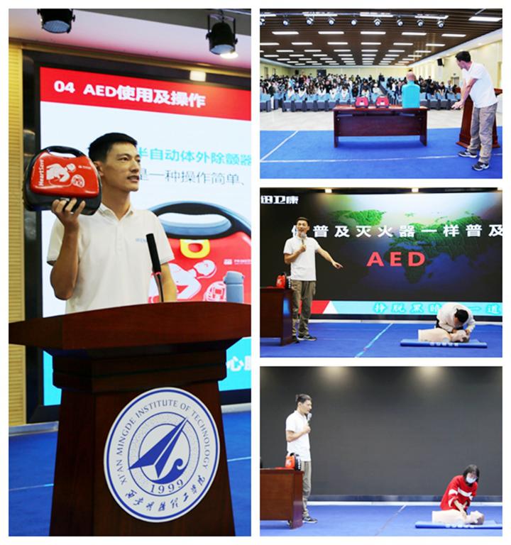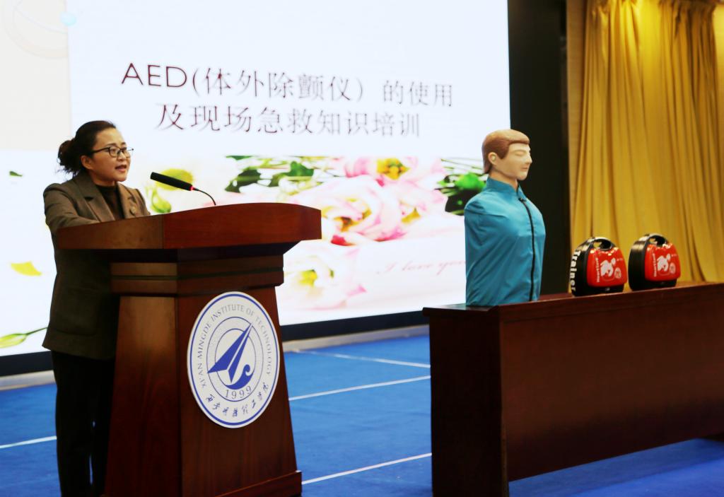 为贯彻落实《教育部等五部门关于全面加强和改进新时代学校卫生与健康教育工作的意见》(教体艺﹝2021﹞7号)精神和《西安市社会急救医疗条例》要求,降低意外风险,应对突发情况,营造“人人为急救、急救为人人”的良好氛围。2023年10月16日下午明康医院在6#教学楼203,特邀河南省红十字会急救员、高级拓展培训师李昂阳举办了AED体外除颤仪的使用及应急救护知识、技能培训。全校医务工作者、辅导员、校卫队员、相关保障人员、部分学生代表参加了培训。会议由明康医院防疫科赵维医生主持。