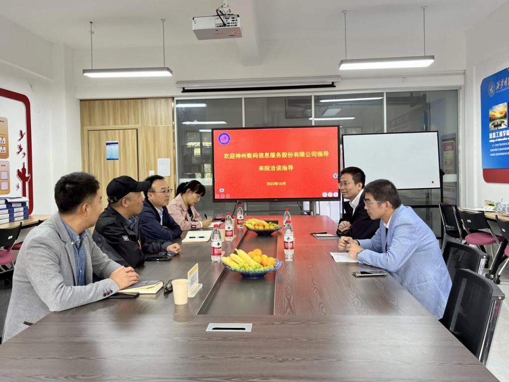 为进一步巩固校企合作基础,提升校企合作成效,促进校企双方多形式开展业务合作,加快推进学生实习、就业。10月19日,神州数码信息服务股份有限公司(以下简称神州数码)金融业务人力资源总监张龙杰、人资专员彭杰受邀来院洽谈交流。学院党委书记兼行政副院长肖千春、副院长范晖、办公室主任尹莹参加交流会,学院党委副书记高长江主持会议。