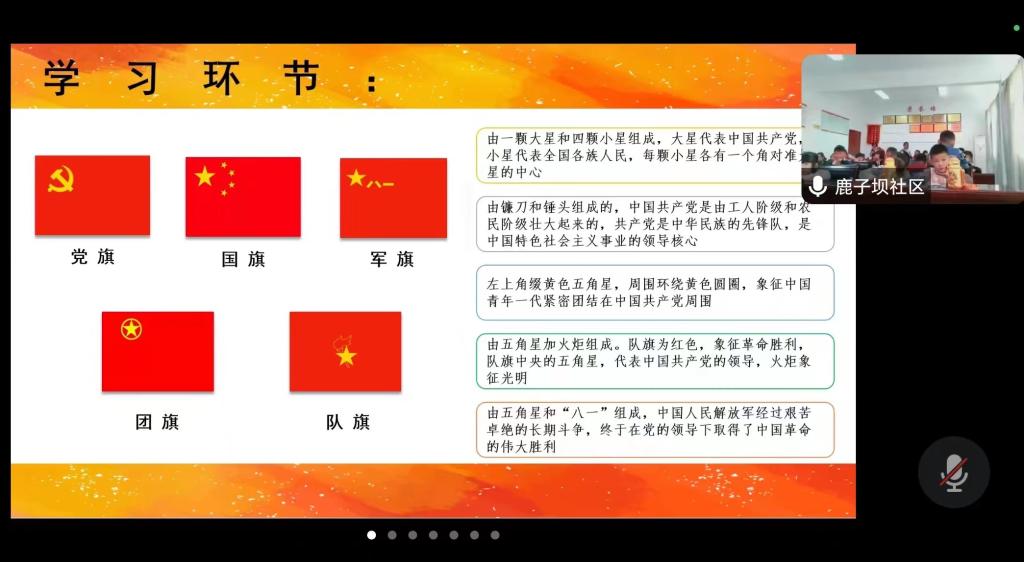 为深入学习宣传贯彻党的二十大精神,培养青少年爱国主义精神和家国情怀。10月28日上午,经济与管理学院学生党支部通过腾讯会议开展“祖国旗帜在我心中”思想引领示范活动,学院学生党员、发展对象、入党积极分子及汉中市镇巴县鹿子坝社区40名儿童参加了活动,活动由学生第五党支部书记邹代柳主持。