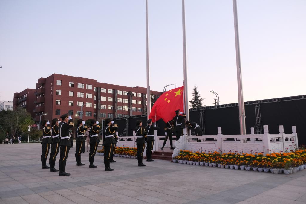 深秋的校园,朝阳柔和。国旗护卫队身着礼服,迎着霞光,迈着铿锵有力的步伐护送鲜艳的五星红旗,伴随着雄壮的《义勇军进行曲》,师生们齐声高唱国歌,向冉冉升起的国旗致以崇高的敬礼,表达对伟大祖国最真挚的情感。
