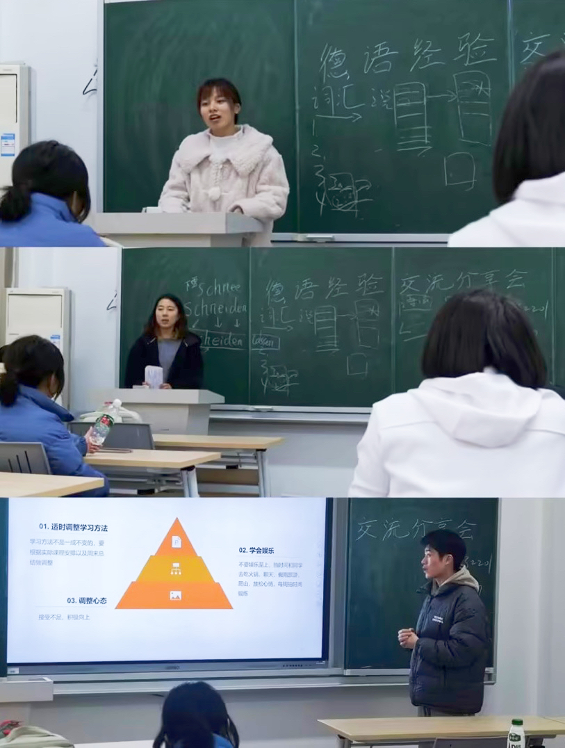 为促进德语专业学生的学习动力、树立优良学风,语言文化传播学院德语专业于12月7日举行了以“如何更好学习德语”为主题的学习经验交流分享会。此次交流,邀请到了2023届优秀毕业生焦景宝、在校优秀学生代表刘延昕、贺文和单长威等与同学们一起分享了德语学习的技巧与经验。