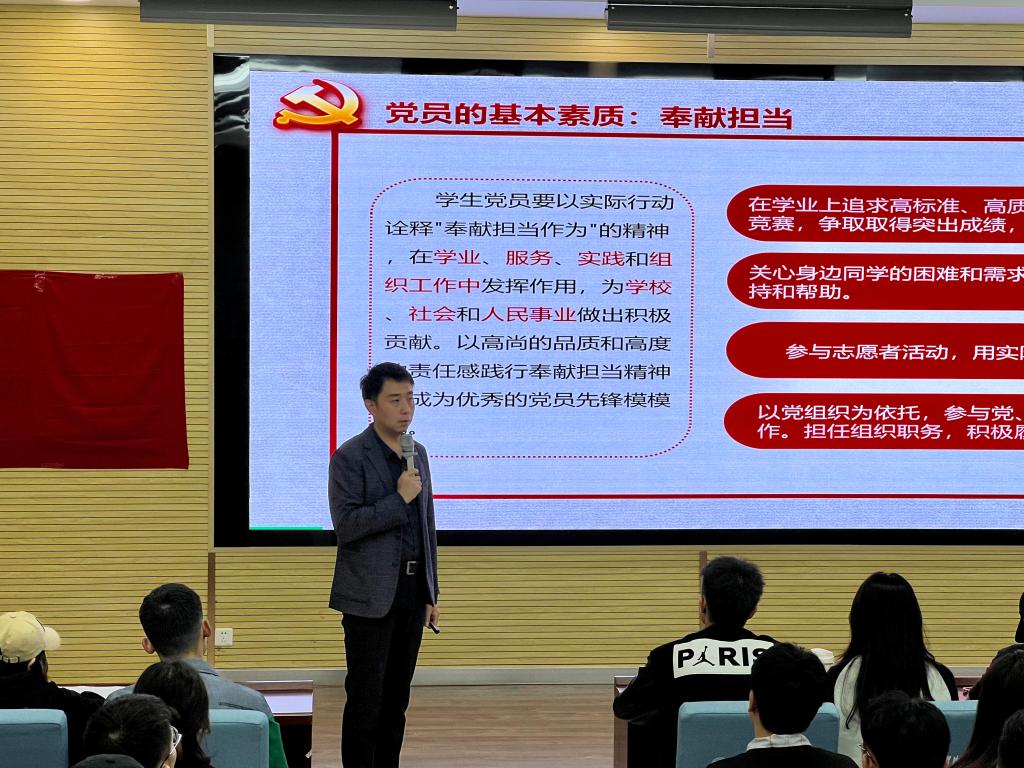 高长江同志分别从奉献责任担当是党员的基本素质、新时代对党员提出的新要求、如何在实践中落实党员的奉献担当精神三个方面进行讲述。他以入党誓词为切入点,强调奉献不仅是党员的基本素质,也是党员的义务;通过介绍为慵懒散、不作为的表现形式等引导与会学生充分理解全面从严治党的紧迫性和责任担当的重要意义。以习近平总书记的重要论述为核心,理论联系实际,期望大家在学生中发挥好先锋模范作用。最后,他强调,入党积极分子要坚定政治立场,时刻对照党员标准,全心全意为同学服务;要不断提升政治素养、脚踏实地做实事、认认真真学本领;讲奉献比担当,争做实现中华民族伟大复兴的脊梁。