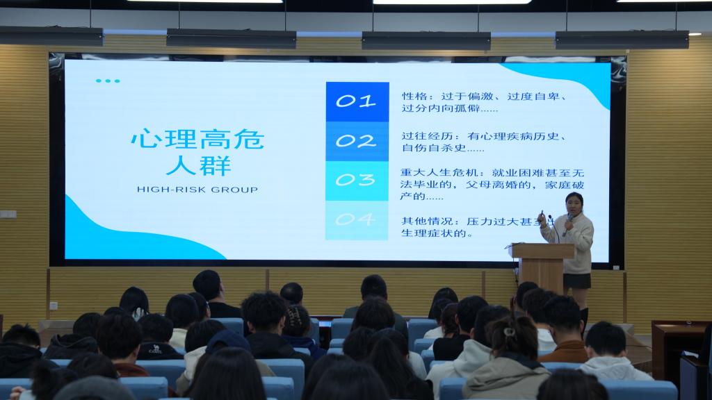 启动仪式结束后,张颖老师为师生们做了题为“学生心理危机干预”的专题辅导。她从什么是大学生心理危机、大学生心理危机的预防、大学生心理高危人群和大学生心理危机干预的方式方法等四个方面做了专题辅导。