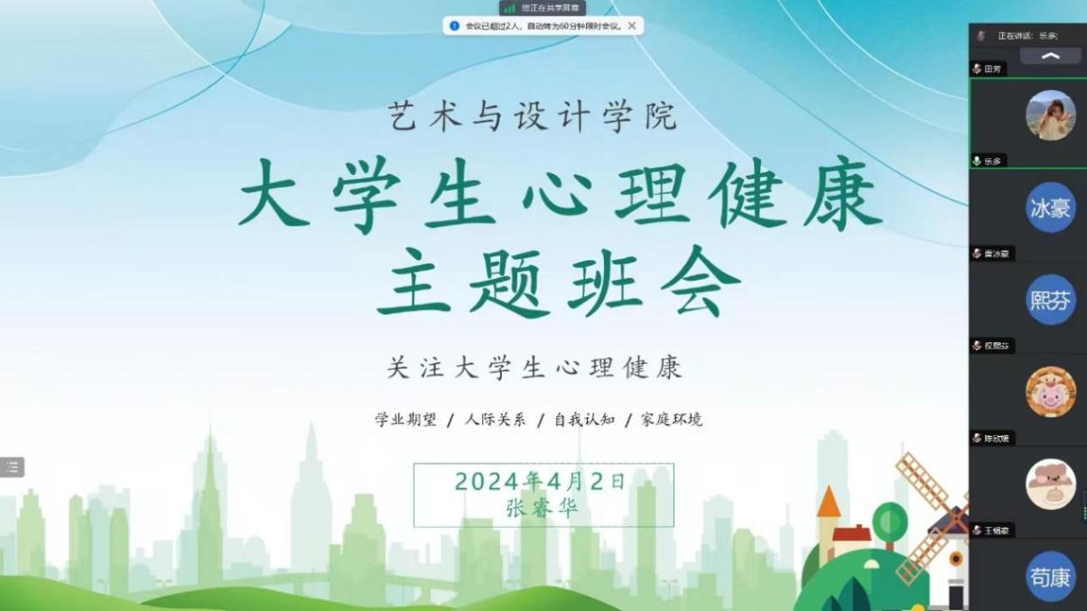 同时,艺术与设计学院毕业班辅导员张睿华、刘一涵以线上形式面向大四毕业班学生开展了大学生心理健康主题班会。主要围绕毕业生临近毕业前的焦虑因素列举,因毕业设计或就业问题产生的心理问题展开分析,鼓励学生在出现困扰或焦虑时积极寻找缓解情绪的出口,及时与老师、同学、家人进行沟通,以积极健康的心态面对就业。