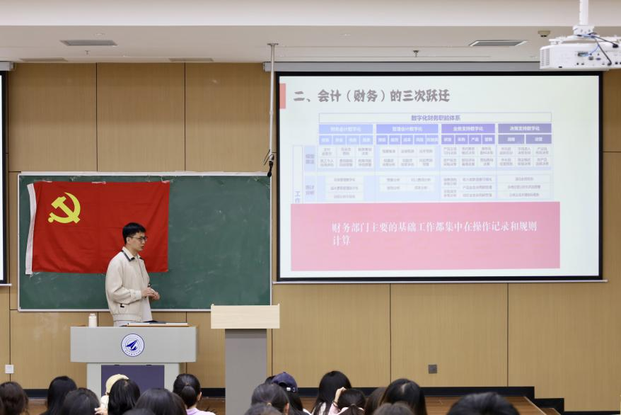 课上,雷宁老师以数智时代会计的变革为主题,从三个方面进行讲述。他首先提出“如果你是老板,将对招聘的会计人员有什么要求”这一问题与同学们进行互动,引发大家的思考。之后,他针对数字化变革提出自己的见解——“三二一理论”,即会计财务的三次跃进,两个能力,一个未来。具体阐述了财务地位的变化、财务的职能架构变化、如何将数据科学引入财务领域等方面,提出会计要解放自己,不断丰富会计参加管理的职能,建立全面的信息化能力,推动会计行业向共享模式发展,实现财务部门对数据的充分加工和应用。雷宁老师讲到,会计人员通过努力学习专业知识,用数字化和智能化创造会计行业更好的未来。