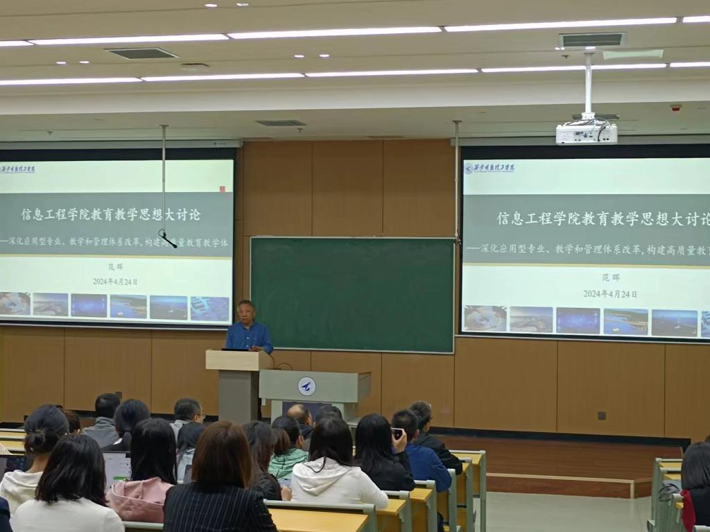 为贯彻落学校“关于进一步开展教育思想大讨论的通知”精神,推进我院教学工作和教学评建工作,4月24日上午,信息工程学院在7#教学楼101教室召开教育思想大讨论会议。此次会议旨在进一步推动应用型专业、教学体系和管理体系的改革,适应新时代教育发展的需求,构建高质量的教育教学体系。全体教师(含实验教师)参加了讨论会,会议由学院教学副院长范晖主持。