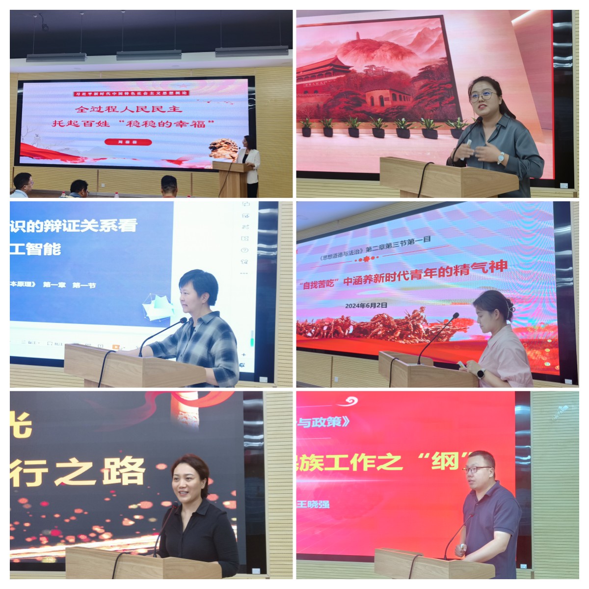 下午,试讲点评环节中,马克思主义学院周蓓蓓、吴梦茜、张乐、胡景莲、党淑敏、王晓强等六位教师分别围绕“全过程人民民主,托起人民‘稳稳的幸福’”“建党精神的特质与内涵”“从物质与意识的辩证关系看人工智能”“在‘自找苦吃’中涵养新时代青年的精气神”“用实事求是之光,照亮勇毅前行之路”“牢牢把握新时代民族工作之‘纲’”等主题进行了试讲。试讲教师们在同台竞技中相互学习、取长补短,提高了教学竞赛的能力和水平。