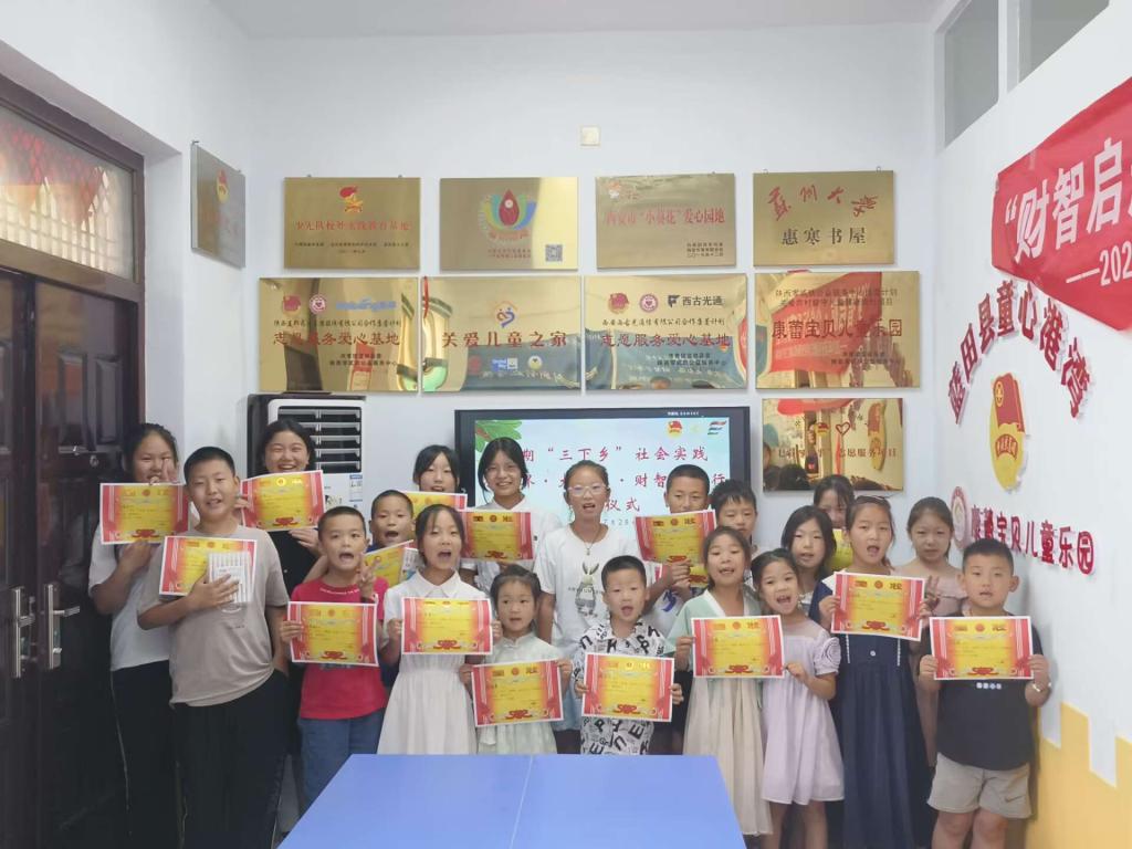 7月28日,ac米兰官方网站“小世界∙大梦想∙财智少年行”三下乡暑期社会实践队赴陕西省蓝田县普华镇童心港湾举行的少儿财商训练营圆满结束。