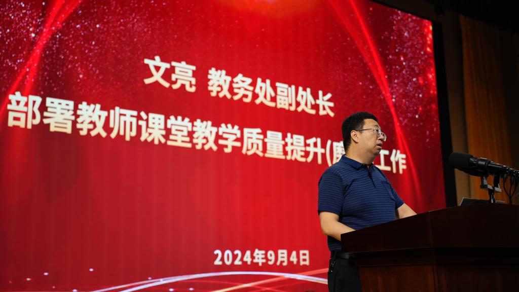 首先,教务处副处长任华对新入职教师表示欢迎,并对本次培训会目的以及培训方案进行了详细介绍。接着,教务处副处长文亮对教师课堂教学质量提升工作进行了全面部署。文亮副处长表示,“好课”是从课堂实践中磨炼出来的,磨课是教师专业化成长的重要途径,有利于提高教师的教学和研究能力。并从课程概述、课程设计、课程目标、学情分析、教学重难点、教学方法、课程特色、创新举措、教学成效等方面对工作方案进行详细解读。