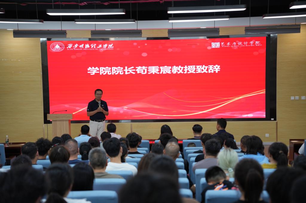 最后,学院院长苟秉宸教授对2024级新生的到来表示了热烈的欢迎,并对学校及学院的历史、发展以及未来的目标进行了简要介绍。苟院长用富有激情和感染力的语言鼓励新生们要勇敢追求梦想,不断探索艺术的无限可能,努力成为既有创意又具备实践经验的高素质设计人才。他的讲话让新生们感受到了艺术的魅力和未来的无限可能。