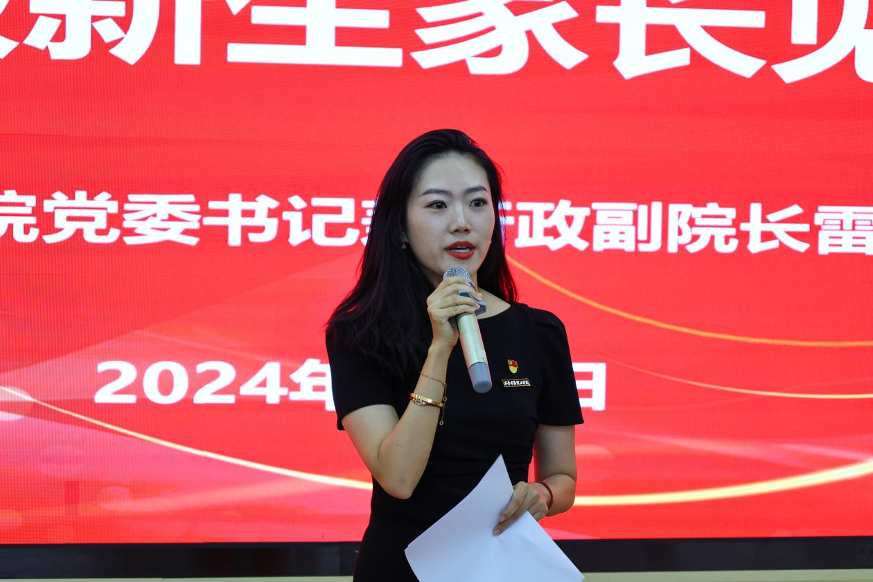 会议伊始,学院党委书记兼行政副院长雷宇发表了热情洋溢的致辞。她首先对2024级新生的到来表示了热烈的欢迎和衷心的祝贺,欢迎他们加入艺术与设计学院这个大家庭,开始全新的大学生活。雷宇书记表示,新生们的到来为学院注入了新的活力和希望,她期待着在未来的日子里,与新生们共同见证彼此的成长与蜕变,并且也呼吁各位新生家长与学校携手共同关心学生成长成才,在学生成长的道路上做最坚实的后盾。