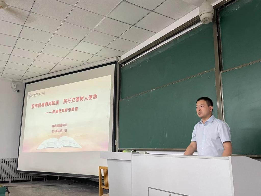 为进一步学习贯彻党的二十届三中全会精神,传达学习习近平总书记在全国教育大会上的重要讲话精神,弘扬崇高师德风范,提高全体教师爱岗敬业、立德树人的责任意识,增强教师的职业道德感、责任感与使命感,经济与管理学院于9月11日在建德楼104召开师德师风建设暨警示教育大会,学院班子成员、青年教师参加了会议,会议由学院副院长许萍主持。